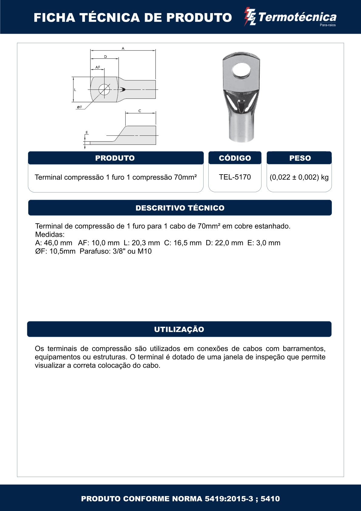 Terminal Estanhado 1 Furo 1 Compressao – 70Mm2 Tel-5170 Termotécnica